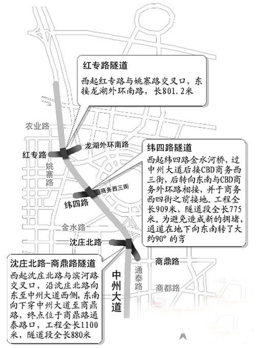 2014年11月30日,鄭州緯四路下穿中州大道工程已實行單幅西向東試通車,而紅專路下穿中州大道也于次日雙向機(jī)動車道放行。預(yù)計春節(jié)前,兩個下穿通道人行道和非機(jī)動車道也將通行,鄭州金水路、中州大道和未來路等周邊道路的交通壓力將得到極大緩解。